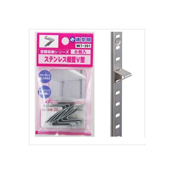 【商品説明】●ステンレス棚支柱WKTシリーズ専用棚受です。●棚支柱への取り付け取り外しが容易で抜けにくい構造です。●別売りの専用支柱とセットで棚板を取り付けてくだい。●クローゼットや押入れなどのデッドスペースに、棚を取り付ける時に使用する支柱用専用棚受としてお使いください。●棚支柱、パーツ類は金属製ですので、手等を傷つけないよう、取り扱いにはくれぐれもご注意ください。●壁面の状態により、耐荷重は異なります。重量物を乗せての使用はしないでください。●棚支柱への取り付けがしっかりできているか確認してからご使用ください。●本製品を使用して発生した破損やトラブル、事故については一切責任を負いませんので予めご了承の上ご使用ください。●本製品は改良等の目的から仕様・寸法・材質・台紙等を予告なしに変更する場合があります。●形状:V型●カバー:無し●安全荷重(kg):30●カラー:シルバー●材質:ステンレス●商品8個