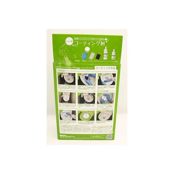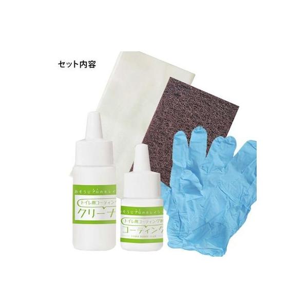 【商品説明】プロ仕様のコーティング剤をご自宅でも!長年使用して失ったツヤを復活させます!シリコン樹脂やガラスコーティングの欠点である、反り・はがれ・透明感を改善したシリコン樹脂とフッ素樹脂のハイブリッド型クリアーコーティング剤です。洗浄効果(クリーナー):各場所に合わせて専用開発したクリーナーが強力な洗浄効果を発揮します。しつこい汚れや頑固な水垢などを除去することで、新品のツヤピカが復活します。防汚効果(コーティング):各場所(素材)にコーティング剤が浸透してできる、コーティング層の力で汚れが付きにくく、汚れてもすぐに取れます。長期耐久性(コーティング):酸に強く、浸透したコーティング剤は、素材が摩耗しない限り残り続けます。長持ちのコツ:撥水が悪くなってきたら、柔らかいスポンジで表面を水洗いしてください。その際コーティング面を傷つけるものは使用を避けてください。(研磨剤入りの洗剤、硬いスポンジ、タワシなど)セット内容:コーティング剤、クリーナー、クロス1枚、スポンジ1個、手袋2組成分・コーティング剤:フッ素樹脂、シリコン樹脂、炭化水素系溶剤【容量:10ml】・クリーナー:有機酸、無機酸、腐食防止剤、安定剤【容量:30ml】・手袋:ゴム・クロス:レーヨン、ポリエステル・スポンジ:ナイロン不織布ご購入前にご確認ください。本製品は陶器便器専用です。古くなってツヤや撥水が悪くなった便器が対象です。※新品の便器には固着せず、はがれる可能性があります。※プラスチック(人工大理石・人造大理石)には使用できません。※便座やフタには使用できません。(乾燥時間)・通常:3時間以上・冬季:6時間以上・完全硬化:24時間※完全硬化してからのご使用をお奨めします。※注意事項・新品やコーティング加工(フッ素加工・ワックス加工等)が施されているところには使用しないでください。コーティング剤が固着せず、剥がれる恐れがあります。あらかじめ住設メーカー等にご確認の上お買い求めください。・施工する前と比べ、仕上がりの風合いが変わることがあります。・事前に目立たないところで試し塗りをして、コーティング剤が定着するかをご確認ください。・コーティング後は、便器表面がザラザラする場合があります。予めご了承ください。・混ぜるな危険:塩素系の商品と一緒に使うと有害な塩素ガスが出て危険です。