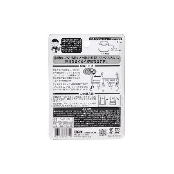 【商品説明】●家具のスベリ材丸キャップは丸い脚の家具やテーブル・イスに取り付けるだけで、お掃除などの際に家具が楽に移動できるように工夫された商品です。●フローリング床をはじめカーペットや畳でのご使用に適しています。●家具の脚に、家具のスベリ材丸キャップを完全に差し込んでください。●家具のスベリ材は床のキズを防止するものではありません。●転倒のおそれがありますので家具のスベリ材を付けた家具を踏み台にしないでください。●底面フッ素樹脂と床の間にゴミや砂などがはさまった場合、床をキズつけることがあります。●床や家具にたわみ等がありますと、家具のスベリ材の特性を発揮できない場合がございます。●重たい家具には家具のスベリ材重量用・コーナー用をご使用ください。●用途以外のご使用はお避けください。●規格:S●適応サイズ(mm):21~24●材質:フッ素樹脂・エラストマー樹脂●商品4個