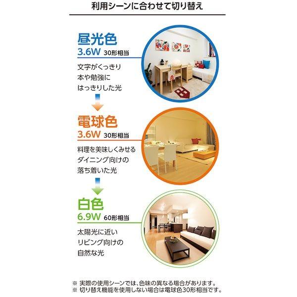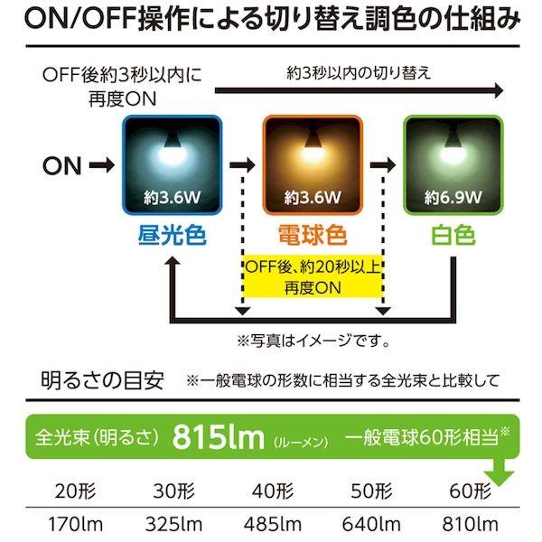 オーム電機メーカーお問い合わせ:0120-963-006【商品説明】特 徴●ON/OFFスイッチで光色が切り替えられるLED電球●壁スイッチで3段階(昼光色/電球色/白色)調色できます●一般電球60形相当の明るさ(白色時)●配光角約270°の全方向タイプ●密閉器具対応●昼光色スタート(切り替え機能を使用しない場合は昼光色のみ)●口金:E26仕 様●寸法:全長…107mm、最大径…60mm●質量:53g●定格寿命:40000h●定格消費電力:昼光色…3.6W、電球色…3.6W、白色…6.9W●全光束:昼光色…422lm、電球色…408lm、白色…815lm●エネルギー消費効率:昼光色…117.2lm/W電球色…113.3lm/W、、白色…118.1lm/W●平均演色評価数:昼光色…84Ra、電球色…81Ra、白色…87Ra※屋内用(屋外禁止)※交流100V 定格電流0.12A 50/60Hz共用≪ご注意≫※次のような器具には使用できません・調光機能のついた器具(100%点灯でも使用不可)・誘導灯、非常用照明器具・HIDランプ器具、水銀灯器具・断熱材施工器具(SB、SGI、SG形表示器具など)・ランプと反射板の距離が狭い器具・直流電流※このほか使用器具の種類によって寸法的、熱的、その他の状況(リモコン機器のついた器具など)により使用できない場合があります※ご使用になられる照明器具の構造によっては、放熱不良で短寿命となることがあります※密閉器具でのご使用の場合、器具の寸法の大きさにより、使用できない場合や寿命が短くなる場合があります