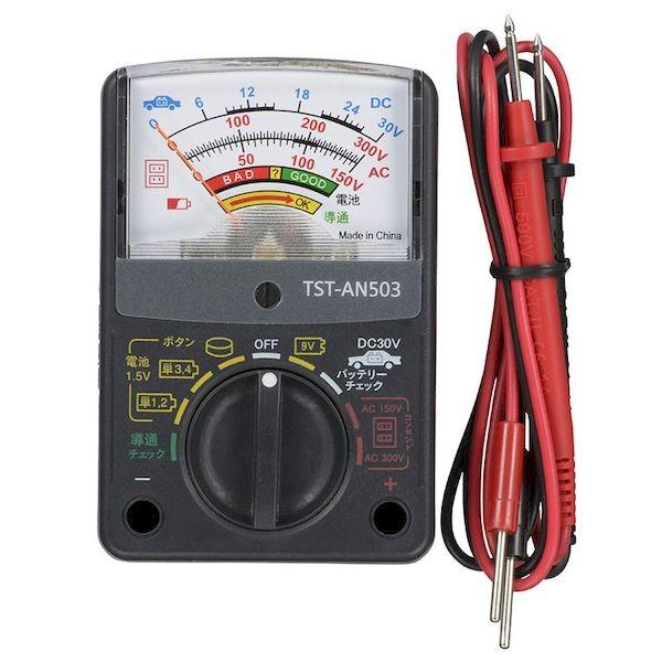 オーム電機メーカーお問い合わせ:0120-963-006【商品説明】特 徴●わかりやすいイラスト付きレンジ表記●乾電池・カーバッテリーなど家庭用電源測定可能●日本語表記で使いやすい●電気製品の故障診断や、電池の寿命チェックに●導通/電池測定/コンセント/カーバッテリーチェックなどに●単3乾電池×1本使用(動作確認用付)仕 様●直流電圧(DC V):30V(12V/24V 自動車用バッテリー)● 交流電圧(AC V):150V/300V(家庭用コンセント電圧)●導通チェック:約100Ω以下でブザー音●電池チェック:1.5V…単1/単2/単3/単4/ボタン電池、9V…006P (6F22)電池●精度:DC V…最大目盛値の±4%、AC V…最大目盛値の±5%●電源:単3形/1.5V乾電池×1本●寸法:幅62×高さ93×奥行35mm●重量:約98g(電池含まず)●付属品:ピンプラグ式テスト棒…赤/黒1組、単3形/1.5V 乾電池 1本(動作確認用)、ミニカンヒューズ(0.5V/250V)1個(内蔵)、保証書付取扱説明書