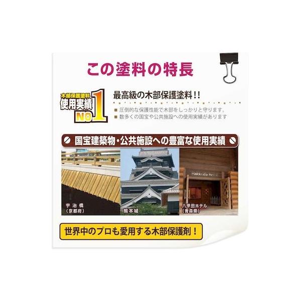 カンペハピオメーカーお問い合わせ:0120-167-167【商品説明】●容量:1.6L●色:パリサンダ●用途:屋外の木部(ウッドデッキ ラティス パーゴラ ベンチ ログハウス 羽目板 板へい)●塗れない物:吸い込みのない木材(プリント合板・デコラ板)、常に水に浸かっている所、犬小屋・鳥小屋※塗装後も保護成分の臭いが若干残りますので、屋内木製品の塗装には不向きです。●特長:・高い信頼と実績!全国の重要文化財や公共施設に使用されているドイツ生まれの高耐久木材保護塗料・高性能防虫・防腐・防カビ・はっ水成分が木材の深部まで浸透し、日光、雨、害虫、カビなどから長期間木材を守ります。・木目をいかしたまま表面に塗膜を作らず着色するので、木材の持つ自然な風合いを引き立たせます。●乾燥時間: 約24時間(20℃) 約3日以上(冬)●重ね塗り時間:12時間以上(20℃) ●塗り面積(m2):約 5.3~8●塗り重ね回数:2回●混入量:-●硬化時間:ー●乾燥時間:試触可能:ー●乾燥時間:歩行可能:ー●剥がす場合:ー●乾燥時間(指触乾燥):ー●乾燥時間(完全乾燥):ー●上塗り塗装間隔:ー●使えないもの:ー●液性:ー●形状:ー●カンペハピオ アサヒペン 塗料 家庭用塗料 ハピオ 水性塗料 トップガード キシラデコール 油性塗料 ラッカー ヌーロ スプレー