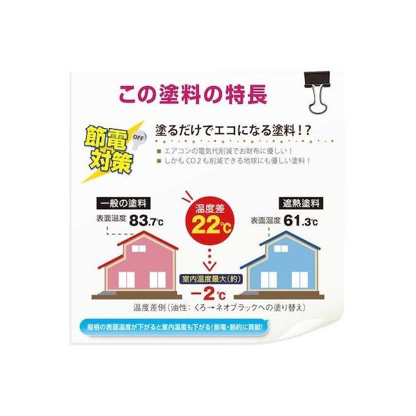 カンペハピオメーカーお問い合わせ:0120-167-167【商品説明】●容量:7K●色:ネオブラック●用途:スレート瓦、新生瓦(カラーベスト・コロニアルなど)、セメント瓦、トタン、鉄部、木部●塗れない物:釉薬瓦、無釉薬粘土系瓦、施釉セメント瓦、施釉コンクリート瓦、乾式洋瓦(モニエル瓦)、シングル系瓦、天然石瓦、ガルバリウム鋼板、ステンレス板、塩ビ鋼板、アルミ板、樹脂板 には塗れません。●特長:・特殊遮熱顔料と赤外線反射顔料が赤外線を反射し、同じ色の従来塗料と比較して屋根の表面温度の上昇を抑えます。また室内温度の上昇を抑える効果もありますので、節電・省エネ効果も期待できます。・遮熱顔料と高耐久アクリル・シリコン樹脂配合のWブロック効果で、紫外線・排ガス・雪・酸性雨など外敵から建物を守り、長期間風合い・ツヤを保ちます。・臭いが少なく、乾燥も速く、使いやすい水性タイプ。※乾くと雨や水で流れ落ちる事はありません。・防カビ剤配合だからをカビの発生から守ります。●乾燥時間: 約1時間(20℃)約2時間(冬期) ●重ね塗り時間:4時間以上(20℃) 6時間以上(冬期)●塗り面積(m2):約 22~32●塗り重ね回数:2回●混入量:-●硬化時間:ー●乾燥時間:試触可能:ー●乾燥時間:歩行可能:ー●剥がす場合:ー●乾燥時間(指触乾燥):ー●乾燥時間(完全乾燥):ー●上塗り塗装間隔:ー●使えないもの:ー●液性:ー●形状:ー●カンペハピオ アサヒペン 塗料 家庭用塗料 ハピオ 水性塗料 トップガード キシラデコール 油性塗料 ラッカー ヌーロ スプレー