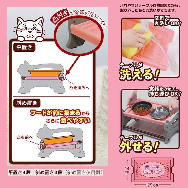 【商品説明】●樹脂製でお手入れが簡単の「外せる!」「洗える!」テーブル、すべり止め付きで食器をホールド。●平置きと斜め置きが選べるので、食べかたに合わせてセットできる。●斜め置きにすれば、フードが前に集まるので食べやすい。●テーブルに突起が付いているので、食器が落ちにくい(平置き時は突起を後ろへ(後ろに落ちにくい)、斜め置き時は突起を前へ(前に落ちにくい)、トレーに食器を載せたまま移動できます。●高さ3・5・7cm。●材質:MDF、ABS樹脂、TPR、天然木●テーブル有効サイズ:巾29cm×奥行14cm●適応種:猫用●セット内容:横板2枚、テーブル置き2本、ネジ4本、テーブル●原産国または製造地:ベトナム●諸注意:・用途・対象を守る。・幼児の手の届く所で使用・保管しない。・必ず平らな場所に置き、次のような所では使用しない。◯火気の近く ◯不安定な所 ◯通行の邪魔になる所 ◯階段のそば ◯戸の開閉の邪魔になる所 ◯倒れやすい物のそば ・本体の上にのったり、食器以外のものをのせたりしない。・飲みこぼしや食べこぼしなどを掃除しやすい場所で使用する。・本体を持ち上げるときは、左右両方の持ち手を持つ。・テーブルに食器をのせて運ぶときは、バランスを崩さないよう両手でしっかりと持つ。・部品などの誤飲防止のため、次のことを守る。○ネジのゆるみや傷みがないか、日常点検(使用前・使用中)および定期点検を行う○万一、ネジなどが外れたときは、すぐに取り付ける○ペットに噛ませない○万一、誤飲したときは、すぐに獣医師に相談する食器台 水洗い可 高さ調整可 簡単組立 猫用 台 食事 ペット