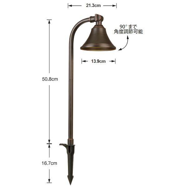 【商品説明】●H508mm×D213mm●電球色3WLED(明るさ:165ルーメン)●ブロンズ色●防雨型●アルミダイキャスト・鉄製●スパイク(杭)・接続コネクタ付属●LED交換不可●90度まで照射方向調整可能●専用トランス及びケーブルが別途必要です●当社指定以外の電子トランスは使用できません
