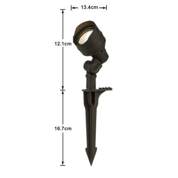 【商品説明】●H121mm×D134mm●電球色4.5WLED(明るさ:205ルーメン)●配光角度70°●照射距離めやす2m(周囲の明るさによって変わります)●黒色●防雨型●アルミダイキャスト製●スパイク(杭)・接続コネクタ付属●LED交換不可●専用トランス及びケーブルが別途必要です●当社指定以外の電子トランスは使用できません