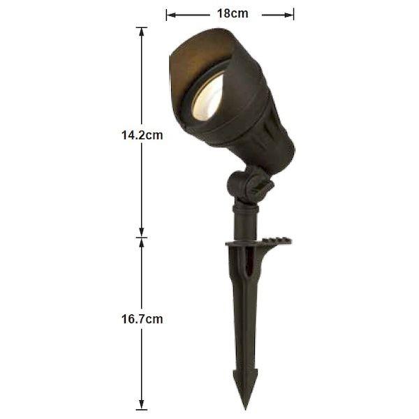 【商品説明】●H142mm×D180mm●電球色13.3WLED(明るさ:540ルーメン)●配光角度70°●照射距離めやす5m(周囲の明るさによって変わります)●黒色●防雨型●アルミダイキャスト製●スパイク(杭)・接続コネクタ付属●LED交換不可●専用トランス及びケーブルが別途必要です●当社指定以外の電子トランスは使用できません