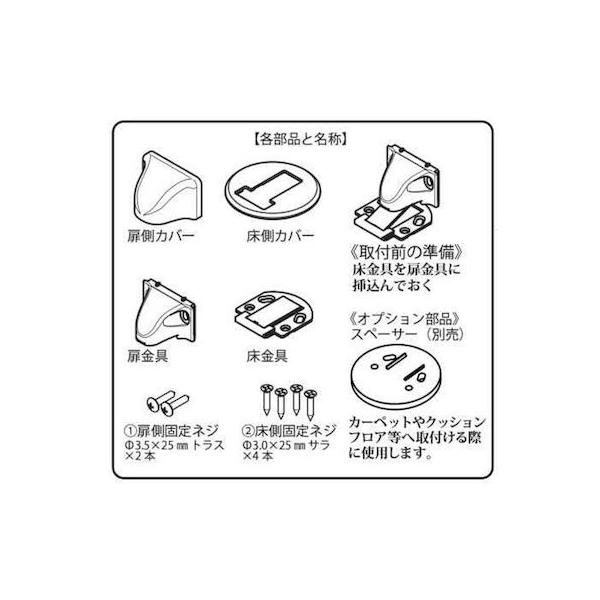 清水メーカーお問い合わせ:06-6723-1971【商品説明】マグネットの力でドアをキャッチ●マグネットによる扉固定と、ラッチによるはね返り防止機能付き。●床側金具の厚みが薄く、歩行や掃除の邪魔になりません。●シンプルなデザイン。ドライバー3 本で簡単取付!●色:ゴールド。●材質 床側金具 (カバー):ABS、(床金具):鉄、扉側金具 (カバー):ABS、(本体):ナイロン・POM。●1。●付属品:扉側固定用トラスねじ直径3.5×25×2本、床側固定用皿ねじ直径3.0×16×4本。●梱包サイズ:15x4.5x10cm。●取付けの際は取扱説明書をよく読んでから行ってください。●スペーサーは別売りです。●扉のロック機構なし。●SH-TMG20G マグネット ドア ストッパー スタンダード ゴールドShimizu キャッチ シンプル