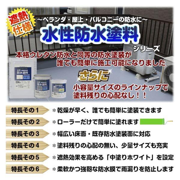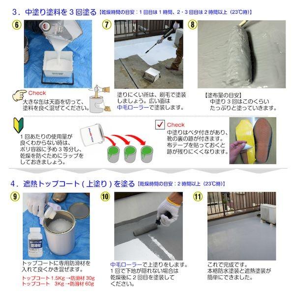 【商品説明】※色見本はご使用端末により若干の誤差がございますので、ご注意ください。【特長】・アトム水性防水塗料専用の遮熱水性トップコート。・最大で表面温度を約12℃下げることができます。【属性・塗り回数】・水性 / 2回塗り【用途】・ベランダ、テラス、バルコニー、屋上の防水のトップコートに【塗り面積】・1.5kg:4~ 5m2・ 3kg:8~10m2【表面乾燥時間】・夏期(23℃基準)2時間以・冬期(5~10℃基準)3時間以上【うすめ液/刷毛洗い】・うすめ液:不要・ハケ洗い:水【使用上の注意】・必ず専用防滑材を混入してから塗装してください。陸屋根 ベランダ バルコニー 屋上 ウレタン DIY 補修 塗り替え 簡単 台風対策 豪雨対策 水漏れ 雨漏り