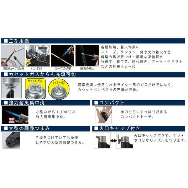 新富士バーナーメーカーお問い合わせ:0533-75-5000【特長】●超小型で強力な耐風バーナーです。●カセットガスより充填可能です。【用途】●小物のはんだ付け、収縮チューブの加熱、各種着火作業に。【仕様】●炎温度(℃):1300●火口外径(mm):14●発熱量(kcal/h):80●色:ブラック【仕様2】●圧電着火方式●超小型強力耐風バーナー【原産国】中国