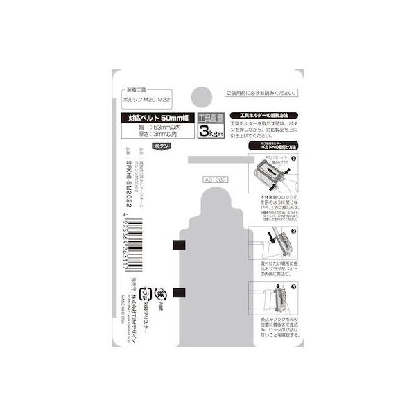 (株)TJMデザインメーカーお問い合わせ:0120-125577【商品説明】●機能●現場要求強度を十分満たした頼れるスチール製 ●ダブルコーティングで着脱を繰り返しても安心なしっかりとした嵌合部 ●後付もでき、ベルトを外さずに腰周りの組み換えがカンタン着脱式 ●激しい動きにも横スベリしないスライドストッパー付 ●「今だけセフ付」長期限定キャンペーン(セフ後付ホルダーSF-CHLD)付 ●仕様●ベルトサイズ:幅53mm以内、厚み3mm以内 ●装着工具:ボルシンM20・M22 ●セフ取付工具総重量:3.0kg以下 ●付属品:セフ後付ホルダーSF-CHLD ●材質●スチール