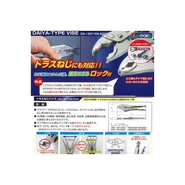 スリーピークスメーカーお問い合わせ:0256-33-0571【特長】●ねじ頭をつかんだ後、固定できるロック付です。●トラスねじにも対応した新設計のたて溝です。●くわえ部はすべて独自設計のダイヤ型とし、計3カ所のくわえ部で、3点支持で確実につかみます。●頭部取付角度を水平にしたことにより、振り幅が狭くなり回しやすくなりました。●口幅調節ねじには六角穴付ボルトを採用しています。六角棒レンチ(8mm)で増し締めが可能です。●従来のバイスプライヤーとしても使えます。【用途】●ドライバーで外せなくなった、つぶれたねじ、サビついたねじ及び、特殊なねじ等の取り外しに。●ダイヤ型のくわえ部は、パイプ等、丸物のクランプに。【仕様】●全長(mm):215【仕様2】●使用範囲:M2~M5(トラスねじ)、M1.6~M8(なべねじ)、3~13mm(六角ねじ)●寸法(mm):A=215/B=58/E=11【材質/仕上】●頭部:S58C【注意】●絶対に電気を通さないで下さい。非絶縁工具です。●ハンマー代わりに使用しないでください。●ハンドルロック解除の際、解除レバーで手などを挟まないように気を付けて下さい。●使用範囲をこえての使用はしないで下さい。【原産国】日本