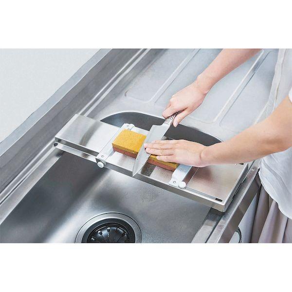 【商品説明】●サイズ:340×135×高さ58mm●シンク幅対応サイズ:330~580mm●砥石対応サイズ:195~265mm●質量:1.9kg●材質:18-8ステンレス(板厚1.5mm)