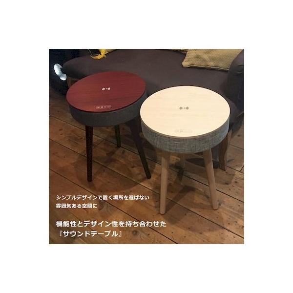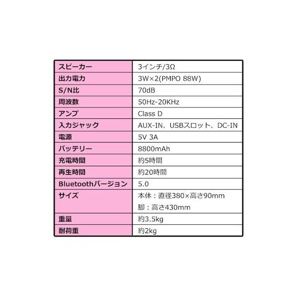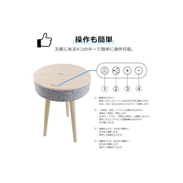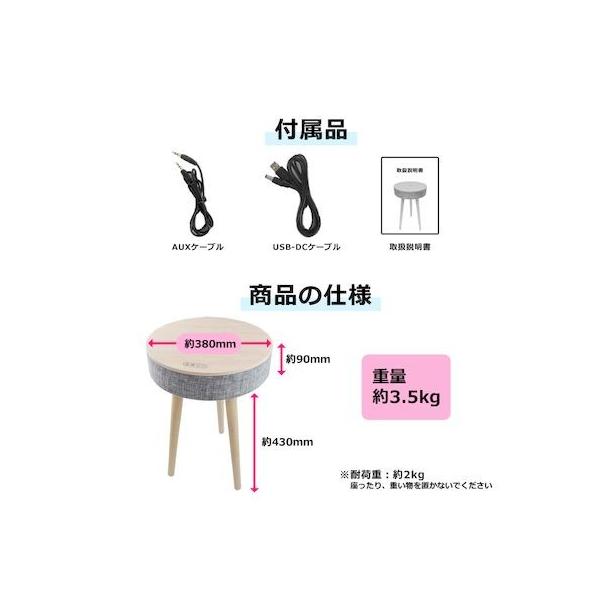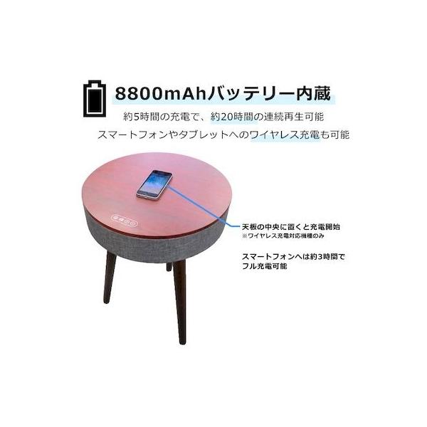 【商品説明】●Bluetooth搭載で、リビングやキッチンなど、どこでも音楽を楽しむことができる「サウンドテーブル」●約5時間の充電で、約20時間連続再生が可能。●8800mAhのバッテリーが内蔵されており、天板にスマホやタブレットを置くとワイヤレス充電も可能!(ワイヤレス充電対応機種のみ)●Bluetoothのバージョンは5.0。ワイヤレスでの接続のため、煩わしいケーブルは不要!●本体裏側にUSB端子を備えているので、USBメモリに入れた音楽データの再生も可能です。●操作簡単、組み立て簡単、木目柄が高級感と温かみのある空間を演出します。●スピーカー3インチ/3Ω●出力電力3W×2(PMPO 88W)●S/N比70dB●周波数50Hz-20KHz●アンプClass D●入力ジャックAUX-IN、USBスロット、DC-IN●電源5V3A●バッテリー8800mAh●充電時間約5時間●再生時間約20時間●Bluetoothバージョン:5.0●サイズ本体:直径380×高さ90mm脚:高さ430mm●重量約3.5kg●耐荷重約2kg●付属品取扱説明書、AUXコード、USB-DCケーブル