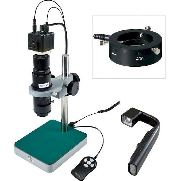 ホーザンメーカーお問い合わせ:06-6567-3132【商品説明】【仕様】●倍率:10~71×(4型モニター相当、実際の液晶サイズ約0.2型)●視野(mm):6.5×3.7~0.9×0.5●作動距離(mm):90●撮像素子:1/2.8” CMOSイメージセンサ●出力コネクター:HDMI●保存画素数(静止画):1920×1080(200万画素)●保存画素数(動画):1920×1080(200万画素)/1280×720(90万画素)●記録媒体:microSD/SDHC/SDXCメモリーカード(最大128GB)●フレームレート(fps):60●ベース寸法(mm):(W)145×(D)【特長】●フレームレートが高く、動きに強い。●幅広い倍率に対応。●パソコン不要。フルHD画質で観察、画像・動画の保存が可能。●ウェアラブルモニター付き。●手元を見ながら拡大映像も見られるため、作業性の向上に繋がります。●7点セット。【セット内容/付属品】フルHDカメラ(L-851)、ズームレンズ(L-817)、ホルダー(L-509)、標準ベース(L-521)、ウェアラブルモニター(SB-64)、LEDライト(L-711)、拡散フィルター(L-711-1)