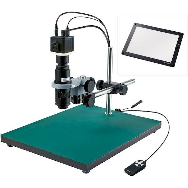 ホーザンメーカーお問い合わせ:06-6567-3132【商品説明】【仕様】●撮像素子:1/2.8” CMOSイメージセンサ●出力コネクター:HDMI●保存画素数(静止画):1920×1080(200万画素)●保存画素数(動画):1920×1080(200万画素)/1280×720(90万画素)●記録媒体:microSD/SDHC/SDXCメモリーカード(最大128GB)●フレームレート(fps):60●ベース寸法(mm):(W)350×(D)450●倍率X:26~190(13~92/L-859使用時)●視野(mm):19×11~2.7×1.5●作動距離(mm):105●照明:L-718【特長】●フレームレートが高く、動きに強い。●大きなワークの検査に最適。●パソコン不要。フルHD画質で観察、画像・動画の保存が可能。【セット内容/付属品】フルHDカメラ(L-851)、ズームレンズ(L-815)、ホルダー(L-509)、ロングベース(L-525)、ロングストレートアーム(L-523)、LEDライト(L-718)【注意事項】※仕様の倍率は24インチモニター使用時、解像度1920×1080設定時の倍率です。