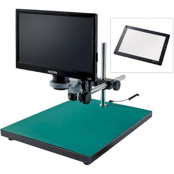 ホーザンメーカーお問い合わせ:06-6567-3132【商品説明】【仕様】●撮像素子:1/3CMOSイメージセンサ●有効画素数:1920×1080(200万画素)●記録媒体:SD/SDHCメモリーカード(最大32GB)●最大フレームレート(fps):30●モニター:11.6型ワイド●ベース寸法(mm):350(W)×450(D)●倍率:9.7×/23×/46×/60×●視野(mm):26×14~4.2×2.3●作動距離(mm):170~45【特長】●その他の機器は一切不要、モニターとカメラが一体になったオールインワンモデル。●大きなワークの検査に最適。●固定倍率での使用に最適。【セット内容/付属品】モニター付カメラ(L-860)、レンズ(L-802-2)、エクステンションリング(L-818)、エクステンションリング(L-819)、ホルダー(L-509)、ロングストレートアーム(L-523)、ロングベース(L-525)、LEDライト(L-718)【注意事項】※仕様の倍率はモニターサイズ11.6型使用時の倍率です。