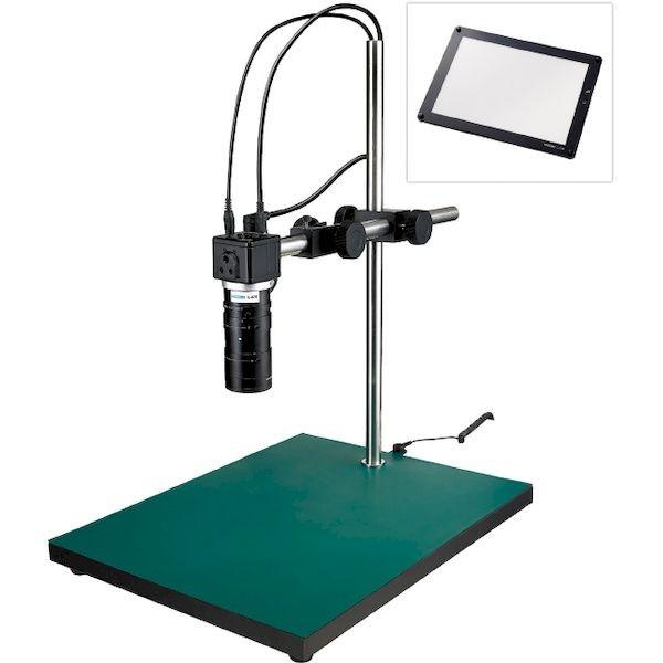 ホーザンメーカーお問い合わせ:06-6567-3132【商品説明】【仕様】●撮像素子:1/2.8” CMOSイメージセンサ●出力コネクター:HDMI●保存画素数(静止画):1920×1080(200万画素)●保存画素数(動画):1920×1080(200万画素)/1280×720(90万画素)●記録媒体:microSD/SDHC/SDXCメモリーカード(最大128GB)●最大フレームレート(fps):60●ベース寸法(mm):(W)350×(D)450●倍率X:2.7~76、1.3~37(L-859使用時)●視野(mm):191×108~6.9×3.9●作動距離(mm):350【特長】●パソコン不要。フルHD画質で観察、画像・動画の保存が可能。●フレームレートが高く、動きに強い。●幅が広く高さのあるワークの検査に最適。●ピント調整機能付、中倍率仕様のズームレンズ。【セット内容/付属品】フルHDカメラ(L-851)、ズームレンズ(L-870)、レンズフィルター(L-50-2)、ロングストレートアーム(L-518)、ロングベース(L-525)、LEDライト(L-718)【注意事項】※仕様の倍率は24インチモニター使用時、解像度1920×1080設定時の倍率です。