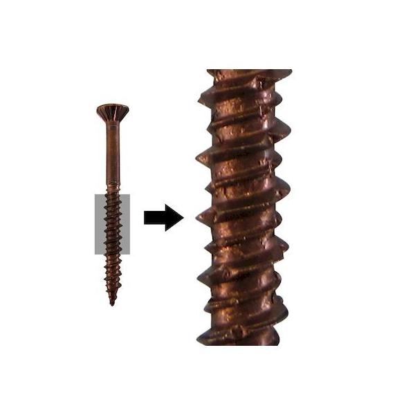 株式会社ウイングメーカーお問い合わせ:0794-82-1300【商品説明】●ケバ立ちがなくシッカリ沈むセレーション付サラ頭。●仕上がりが美しいダウンフェイスリセス。●超硬木に軽く切れ込むダイヤカット付の高低二条ネジ。●トルクをシッカリ伝える四角頭。●デッキ材に同調するテンパーブロンズ仕上げ。●安心の防錆力ステンレスSUS304製●1箱にSQビット1本付。●ウリン等の超硬木には必ずストレートの下穴をあけ皿取りをしてください。●ステン・ウッドデッキビス 5.5×55mm
