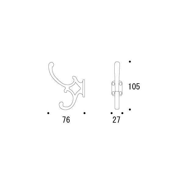 ●特徴:真鍮製のコートフックです。美しいアーチが印象的で繊細なデザインのコート掛けです。デザイン性に富んでいて、レトロでアンティーク風な内装にもマッチします。●用途:アンテーク調な家具・レトロ調なデザイン家具などに、店舗やホテルやゲストハウスから戸建て住宅・マンションに●主材質:真鍮●色/仕上:古色/真鍮古色仕上げ●サイズ 幅×高さ×奥行(mm):27×105×76●耐荷重:約5kg●入数:1●生産国:台湾●付属品:取付ビス(3.1×16 4P)