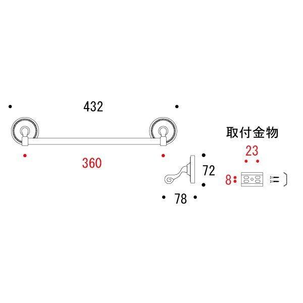 ●特徴:エレガントでアンティーク風の真鍮製タオル掛けです。トイレやキッチン・洗面所など幅広くご使用いただけます。●用途:アンテーク調な家具・レトロ調なデザイン家具などに、店舗やホテルやゲストハウスから戸建て住宅・マンションに●主材質:真鍮●色/仕上:銀色/真鍮クローム仕上げ●サイズ 幅×高さ×奥行(mm):432×72×78●重量(g):約430●耐荷重:約5kg●サイズ内寸(mm):約360●入数:1●生産国:台湾●付属品:取付ビス(3.5×25)