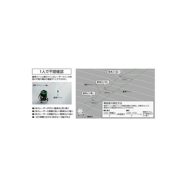 シンワ測定メーカーお問い合わせ:0120-666-899【商品説明】●不陸とは・不陸チェッカーとは】●不陸とは、床面にうねりや凹凸があることを指し、不陸チェッカーは床面の不陸や傾斜の位置、高低の差を数値で確認できます。さらに、従来のレベルやオートレベルを用いて2人以上で行っていた作業を1人で行うことが可能です。●【1人で不陸確認】●基準ラインと測定ラインのレーザーラインで床面の不陸や傾斜の確認が1人でできます。●【リモコンで本体を回転】●不陸の確認と同時に本体の回転操作ができます。●【見やすいライン】●視覚的に見やすいとされる緑色のレーザーを採用し、不陸確認がはかどります。●【防塵・防水構造ボディ】●ホコリの多い環境、急な雨でも安心です。●【持ち運びに便利な取手付】●幅の広い取手なのでしっかりと持つ事ができます。●仕様●【レーザーロボ】●光源 可視半導体レーザー●出力 5mW以下(クラス3R JIS C6802:2014)●波長 510nm~538nm(緑)、下部スポット:650nm(赤)●高低差測定精度 7.5mで±1mm●精度保証距離 10m※高低差の測定、算出を行う場合に保証する精度です。これ以上の距離でも測定は可能ですが精度を保証するものではありません。●視認可能距離 0.5m~20m※照度が約200ルクス(細かい作業をする際に暗いと感じる程度)の環境での数値です。使用する環境によって異なります。●ライン光巾 基準ライン:5mで1.8mm(7.5mで2mm)、測定ライン:5mで3mm(7.5mで3.5mm)●自動補正範囲 ±2.5°●傾斜時警告 自動補正範囲を超えるとレーザーラインが点滅(約1秒間隔)●制動方式 振り子+磁気ダンパー方式●電源 単3アルカリ乾電池4本または ACアダプター●連続使用可能時間 5.5時間●電池消耗警告 電源ON時にレーザーラインが約8秒点滅(約0.5秒間隔)●防塵・防水性能 保護等級 IP54(乾電池使用時)●本体サイズ 高さ182mm×巾120mm×奥行き128mm ●製品質量(電池含) 約1,350g●付属品 アルミケース、単3アルカリ乾電池4本(本体用)、ACアダプター、リモコン、単4アルカリ乾電池2本(リモコン用)●【リモコン】●通信距離 最大20m※本体とリモコンを結ぶ直線上に遮蔽物がない環境で通信可能な最大距離です。●オートパワーオフ 無操作状態で約7分後●電源 単4アルカリ乾電池2本●防塵・防水性能 保護等級 IP54●本体サイズ 42×100×21mm●製品質量(電池含) 約100g