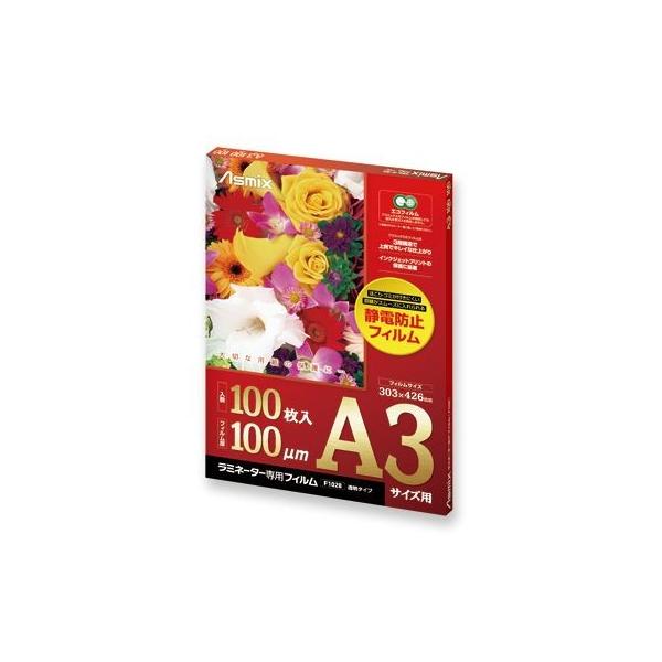 アスカメーカーお問い合わせ:03-5690-9412【商品説明】●大切な用紙の保護に、ラミネーター専用フィルム 100? 100枚入り●ゴミやほこりが付きにくい●静電防止フィルムだから原紙を入れやすい●3層構造で仕上りキレイ●エコフィルムだから燃焼しても塩化水素ガスが発生しません●A3 303×426mm