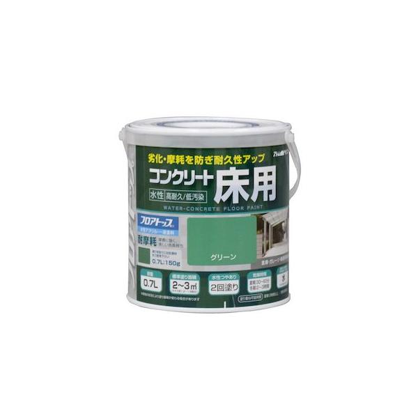 【商品説明】※色見本はご使用端末により若干の誤差がございますので、ご注意ください。【特長】・塗膜が硬く、摩耗に強いコンクリート床用塗料です。・低温時の塗装でもひび割れ等のトラブルになりにくいです。・来客用駐車スペースの塗装や、中古車センター、機械室の床などにも使われています。【属性・仕上がり感・塗り回数】・水性アクリル1液 つやあり/2回塗り【用途】・ガレージ、玄関、事務所、倉庫、機械室などのコンクリート床面【塗り面積】・0.7L :2 ~ 3m2(タタミ枚数換算 1.2~1.8枚)・1.6L :5 ~ 7m2(タタミ枚数換算約4枚)・7L : 20 ~30m2(タタミ枚数換算 12 ~ 18枚)・14L : 40~60m2(タタミ枚数換算24 ~ 36枚)【表面乾燥時間】・夏期 30~60分、冬期 2~3時間【うすめ液/刷毛洗い】・通常/不要、濃い時/水・ハケ洗い:水【使用上の注意】・専用の防滑材を混ぜると、ノンスリップ加工にできます。 ・水性下塗剤を必ず塗ってください。 未塗装コンクリート面であれば、 防水クリヤー塗料も使用できます。 ・新しいコンクリートやモルタル面は、施工後4週間以上経ってから塗装してください。・常に水の溜まる所には塗れません。