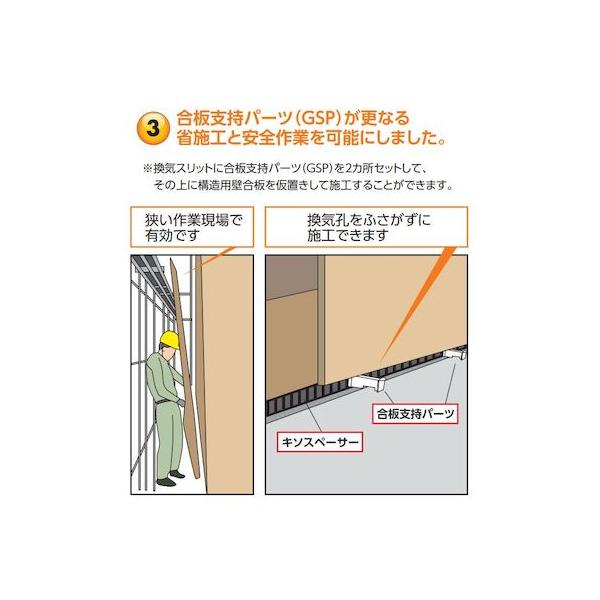 【商品説明】●特徴:キソスペーサーショートウエイトタイプ(合板支持パーツ付)。※換気スリットに合板支持パーツ(GSP)を2カ所セットして、その上に構造用壁合板を仮置きして施工することができます。キソスペーサーによる床下全周換気工法で、床下の換気性能が向上し、防湿対策に効果があります。土台の湿気をおさえ腐朽菌の発生防止に効果があります。●寸法:W100×L100×H20mm●製品重量:約145g●材質(色):オレフィン系複合樹脂(ブラック)●対応土台寸法:105角、404(204)用(※404:89×89mm、204:38×89mm)●付属品合板支持パーツ1本