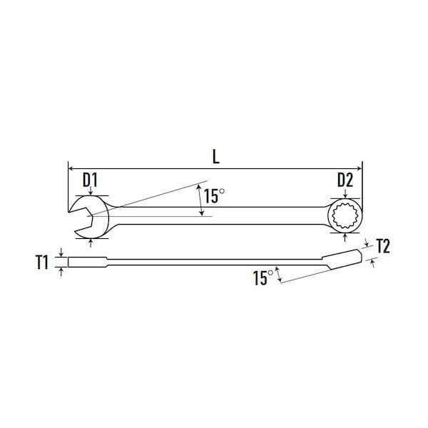 ロブテックスメーカーお問い合わせ:072-980-1111【特長】●早回し仮締めはスパナ側、本締めは面接触を採用しためがね側の1丁2役で使えます。●油が付着しても滑りにくい梨地仕上げです。●狭い箇所で使いやすくヘッドをさらにコンパクト化しました。●めがねは面接触タイプを採用しています。●柄は握りやすく、しなりに強い断面形状へ強化しました。●サイズ表記を大きくし視認性を向上させています。【用途】●ボルト、ナットの着脱に●早回し仮締めは「スパナ」と、本締めは面接触を採用した「めがね側」で、1丁2役で使えます。【仕様】●めがねサイズ(mm):14●二面幅寸法(mm):14●スパナサイズ(mm):14●全長(mm):190●立ち上がり角(°):15●厚さ(mm)T1:6.0●厚さ(mm)T2:9.5【仕様2】●梨地仕上げ●薄型ロングタイプ●幅:スパナ部13.2/メガネ部10.4(mm)●厚み:スパナ部3.0/めがね部4.5(mm)【材質/仕上】●特殊鋼【原産国】日本