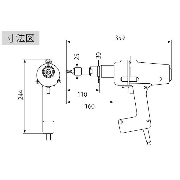 ロブテックスメーカーお問い合わせ:072-980-1111【商品説明】●100V電源があれば、ノーズピース、スクリューマンドレルの交換だけで3~10Mのすべてのエビナットが使用可能。●差し込み式リレーは交換が簡単、寿命もアップ。●ワンタッチ正転・逆転レバー付き。●スイッチを引くだけで、ワンアクションでカシメ完了。【用途】●M3~M10のエビナットのかしめ作業に。●タップ立てが困難な薄板に。●閉鎖断面(角・パイプ・アルミ押出材・手の入らない部位)に。●溶接の困難な表面処理鋼材・非鉄金属に。●溶接の出来ない樹脂製品に。【注意・使用条件】●3Mご使用の場合は別売のスクリューマンドレル、ノーズピースが必要です。●エビロレットナットをご使用の場合は別売のノーズピースが必要です。●使用電源は、銘板に表示してある電圧(100V)でご使用ください。●電源:単相100V 50~60Hz●消費電力(W):303●連続運転時間(分):5●コード長さ(m):2.5●使用範囲:(M3)、M4、M5、M6、M8、M10