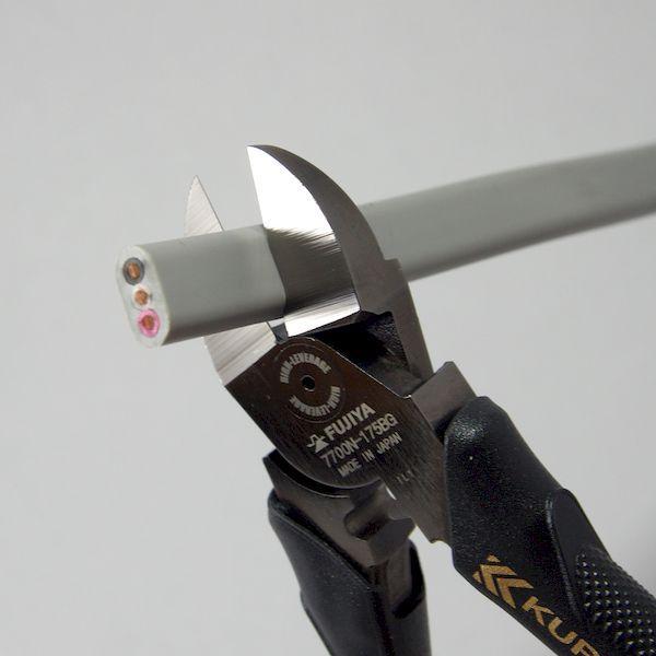 フジ矢メーカーお問い合わせ:0120-248-440【特長】●黒金仕様、万能薄刃ニッパです。●マイクロミラーブレード(刃部鏡面仕上げ)(切れ味20%アップ)と偏芯テコ原理の採用(30%負荷低減)でフジ矢史上最高の切れ味を実現しました。●落下防止コードを取り付けることができるシャックルを付けておりますので、高所での作業などに便利です。【用途】●電気工事でのVVF(VA)線の切断に最適です。【仕様】●切断能力(mm)銅線:φ3.5●全長(mm):186●切断能力(mm)VA線・VVF線:φ2.6×3芯●落下防止用ひも取付穴:有●刃表面形状:ストレート刃(薄刃)●ばね:無●ハンドル:樹脂【仕様2】●ストレート刃●刃部鏡面仕上げ●偏芯テコ原理採用【材質/仕上】●特殊鋼【注意】●電気の流れている物への切断は絶対にしないでください。●感電の恐れがあります。●本来の目的以外に使用しないでください。●作業時は周りの安全を確かめてご使用ください。●保護メガネ等を着用して作業をしてください。【原産国】日本