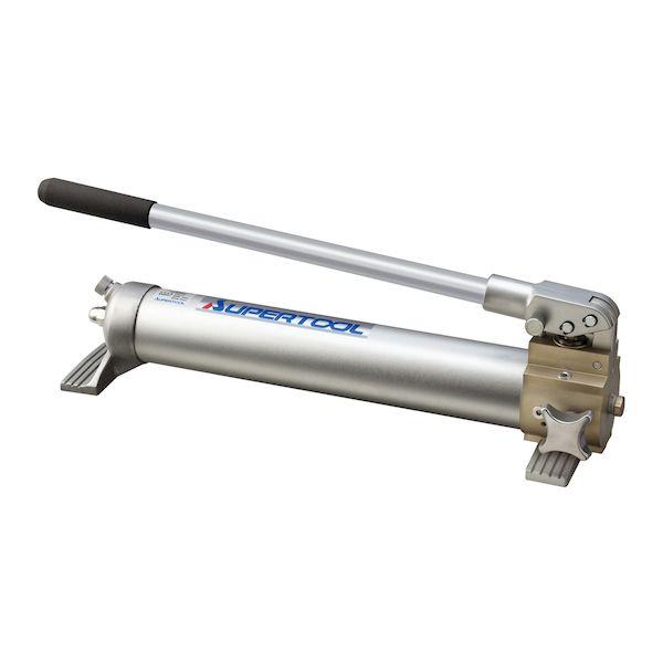 スーパーツールメーカーお問い合わせ:0120-86-4859【商品説明】●ポンプヘッド部は、強靭なジュラルミン製です。●アルミ製なので、鉄製ポンプの約半分の質量です。●高圧・低圧の二段自動切換の吐出型ポンプです。【用途】単動式シリンダ用油圧ポンプ●一操作時の吐出量(cc)低圧:13.5●一操作時の吐出量(cc)高圧:2.4●吐出口径(Rc):3/8●質量(kg):3.8●適合シリンダ:単動式