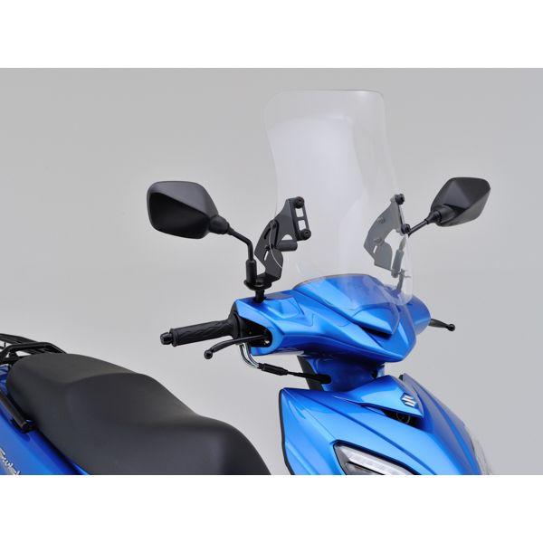 デイトナメーカーお問い合わせ:0120-60-4955【商品説明】スポーティーなエアロフォルムのウインドシールドセット。ポリカーボネート(厚さ3.1mmクリアー)を採用。同厚のアクリルに対し約30倍の強度を持ち、高い透明度と耐久性を両立。またコーティングを施し耐傷性、耐UV性をアップ。ウインドシールドの角度調整(約10度)が可能な車種専用の取付ステー付き。スマホやメーター等が装着可能なオプションバーφ22.2×58L付属。