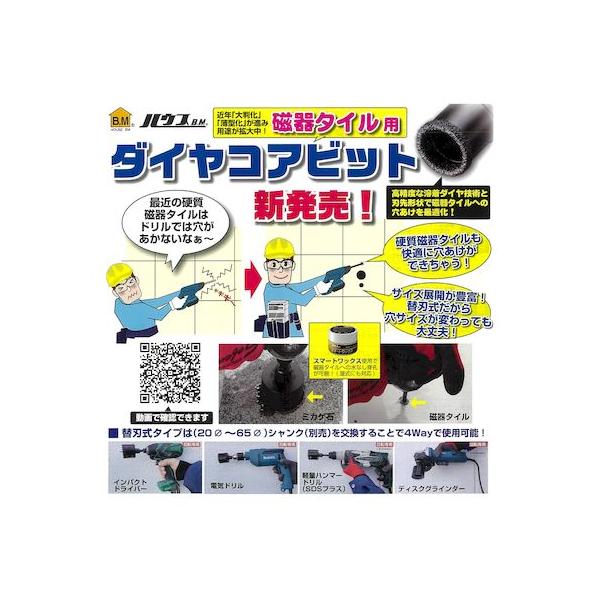 ハウスビーエムメーカーお問い合わせ:0256-34-7384【商品説明】●サイズ 3,5mm 全長65mm 有効長30mm 6,35軸一体型●用途 ●磁器タイル、石板、瓦、セラミック系サイディング、人造大理石、ガラス等 ●特徴 ●放熱性の高いスマートワックスにより、磁器タイルへの水なし穿孔が可能です。(湿式にも対応)●高精度な溶着ダイヤ技術と特殊な刃先形状で、効率的な穿孔を実現しました。●?インパクトドリル、電動ドリル、軽量ハンマードリル(SDSプラス)、ディスクグライダーの4-WAYに対応します。(Φ20以上)●Φ3.5~Φ65mmの幅広いサイズラインナップと豊富な周辺部品で様々なユーザーニーズに対応します。●必ずスマートワックス又は水を用いて穴開けしてください、使用しない場合は先端が焼け使用出来なくなります
