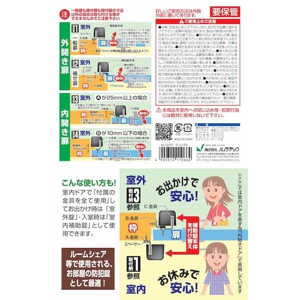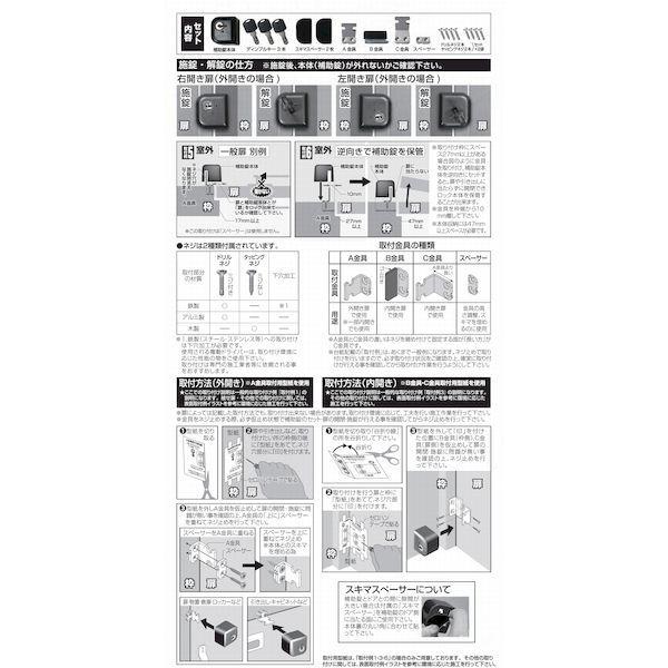 ノムラテックメーカーお問い合わせ:06-6756-7301【商品説明】●外開きドア・内開きドアに『ネジ止め』にて後付できる『キータイプ』のドア用補助錠。室内ドア・ロッカー・外開きの被せ扉まで取り付け、ご使用できます。キーは防犯性の高いディンプルキー採用で、スペアキー3本付き。室内ドアで『付属の金具を全て使用』してお出掛け時は『室外錠』入室時は『室内補助錠』として使用できます。ルームシェア等で使用される、お部屋の防犯錠として最適です。●材質:補助錠本体/アルミダイカスト(塗装仕上)、ディンプルキー/真鍮(ニッケルメッキ仕上)、スペーサー・取付金具・取付ネジ/ステンレス