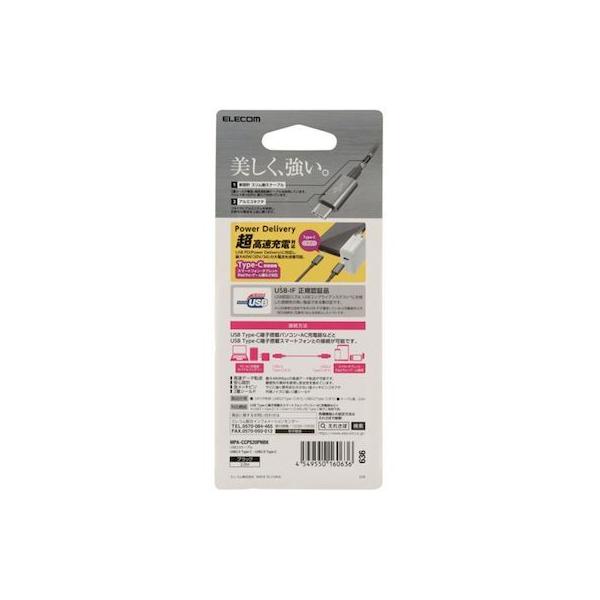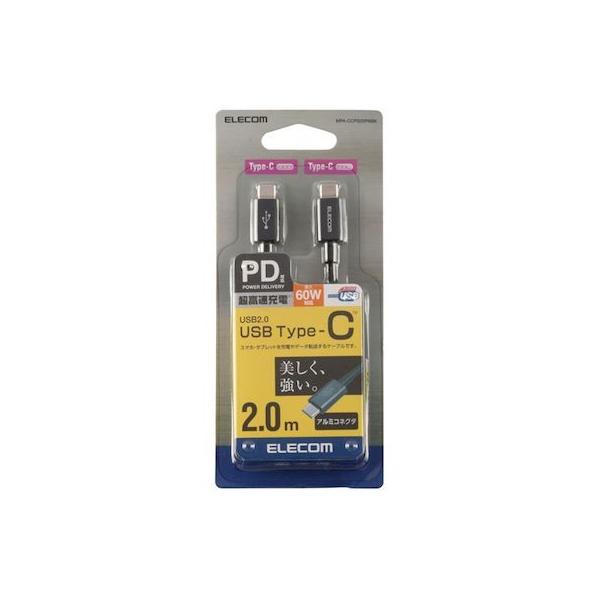 エレコムメーカーお問い合わせ:0120-898-794【商品説明】●コネクタ形状:USB Type-Cオス-USB Type-Cオス ●対応機種:USB Type-C端子を持つパソコン・充電器・モバイルバッテリーおよび、USB Type-C端子を持つスマートフォン・タブレットなど ●ケーブル長:2.0m ※コネクタ含まず ●ケーブル太さ:3.8mm ●規格:USB2.0規格正規認証品 ●対応転送速度:最大480Mbps ※理論値 ●パワーデリバリー対応:○ ●プラグメッキ仕様:金メッキピン ●シールド方法:2重シールド ●カラー:ブラック ●パッケージ形態:ブリスター