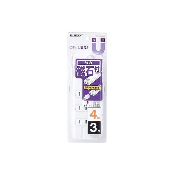 エレコムメーカーお問い合わせ:0120-898-794【商品説明】●本体差込口形状:2ピン(側面に設置した1個口のみ3ピン対応※アース機能はありません) ●本体差込口個数:4個口 ●プラグ仕様:2ピン ●コード長:3.0m ●定格:125V・15A・1500W ●雷ガード:○ ●ほこりシャッター:○ ●絶縁キャップ付きプラグ:○ ●二重被ふく:○ ●スイングプラグ:○ ●マグネット:○ ●カラー:ホワイト ●材質:本体:ABS樹脂、プラグ:PVC 差込口:ユリア樹脂 ●外形寸法:幅40mm×奥行121mm×高さ23mm ※コード部分及びプラグ部分を除く ●質量:約290