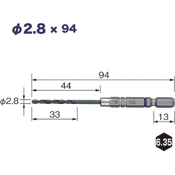 ベッセルメーカーお問い合わせ:0120-999-914【特長】●クッションドリル(鉄工用)の3本組です。●芯振れ激減で高速穴あけができます。●食い付き性がよく、ポンチ(ドリルの先端が逃げないように穴の中心を決めるマーキング)が不要です。●(効果を発揮する3.0mm以上に採用しています。●)●高硬度HSS(ハイス鋼)で、鋭い切れ味が持続します。●クッションドリルは、溝加工したドリルを軸に、プレス絞りで一体化しました。●(結合力を高めるため、1.8mm以上は2面カットを入れてさらに強化しています。●)また、樹脂リングが芯振れ・ガタつきを抑制し、正確な穴あけを実現します。●ケッサクドリルは、先端から根元部分(シャンク側)に向かって、らせん(フルート)の角度が緩やかになるように加工してますので、切粉がスムーズに排出され、高速に穴あけができます。【用途】●鉄、軽金属、合成樹脂、木材などの各種穴あけ、タップ用の下穴あけに。【仕様】●シャンク径(mm):6.35●セット内容(mm):2.8×3本●全長(mm):94【仕様2】●18V対応●6.35mmの六角軸タイプ●X形シンニング(φ3.0mm以上)【材質/仕上】●高速度鋼HSS(ハイス)鋼【注意】●正しい用途・サイズ・使い方を確かめてご使用ください。●穴あけ直後のドリルは高温になり、やけどの恐れがありますので十分にご注意ください。●加工物はしっかり固定し、ドリルを加工物に対して直角に押し付けてください。●インパクトドライバーでの衝撃を加えた使用はしないでください。●ドリルの破損や切りくずの飛散には十分にご注意ください。【原産国】中国