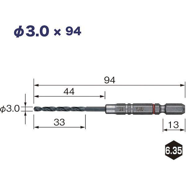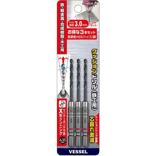ベッセルメーカーお問い合わせ:0120-999-914【特長】●クッションドリル(鉄工用)の3本組です。●芯振れ激減で高速穴あけができます。●食い付き性がよく、ポンチ(ドリルの先端が逃げないように穴の中心を決めるマーキング)が不要です。●(効果を発揮する3.0mm以上に採用しています。●)●高硬度HSS(ハイス鋼)で、鋭い切れ味が持続します。●クッションドリルは、溝加工したドリルを軸に、プレス絞りで一体化しました。●(結合力を高めるため、1.8mm以上は2面カットを入れてさらに強化しています。●)また、樹脂リングが芯振れ・ガタつきを抑制し、正確な穴あけを実現します。●ケッサクドリルは、先端から根元部分(シャンク側)に向かって、らせん(フルート)の角度が緩やかになるように加工してますので、切粉がスムーズに排出され、高速に穴あけができます。【用途】●鉄、軽金属、合成樹脂、木材などの各種穴あけ、タップ用の下穴あけに。【仕様】●シャンク径(mm):6.35●セット内容(mm):3.0×3本●全長(mm):98【仕様2】●18V対応●6.35mmの六角軸タイプ●X形シンニング(φ3.0mm以上)【材質/仕上】●高速度鋼HSS(ハイス)鋼【注意】●正しい用途・サイズ・使い方を確かめてご使用ください。●穴あけ直後のドリルは高温になり、やけどの恐れがありますので十分にご注意ください。●加工物はしっかり固定し、ドリルを加工物に対して直角に押し付けてください。●インパクトドライバーでの衝撃を加えた使用はしないでください。●ドリルの破損や切りくずの飛散には十分にご注意ください。【原産国】中国
