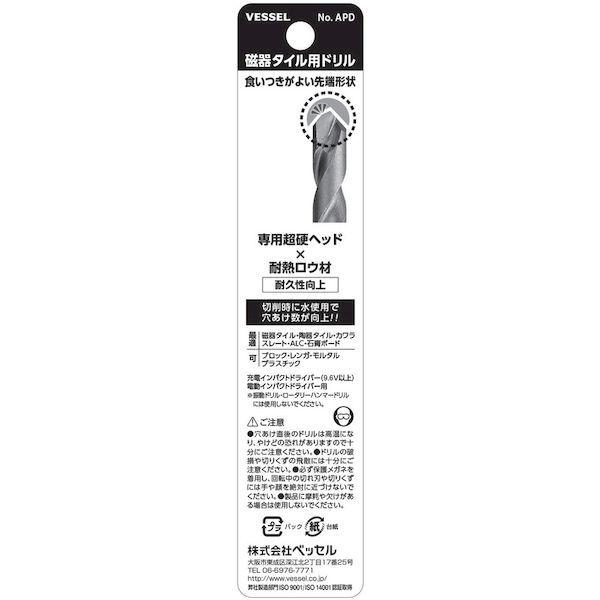 ベッセルメーカーお問い合わせ:0120-999-914【特長】●専用設計された先端形状と材質により、磁器タイルなどの難しい被削材にも、滑らず確実に穴あけできる超耐久ドリルです。●切削時に水を同時にお使いいただくことで、さらに耐久性が上がります。●磁器タイル専用超硬ヘッド&耐熱ロウ材採用で耐久性バツグンです。●ベッセル独自のクッションリングで、チャック内でのガタツキを抑制できます。●先端部の喰いつき性能と合わせて、狙った場所へしっかりと穴あけできます。【用途】●浴室・キッチン、屋根、外壁などの穴あけ作業等に。●被削材:磁器タイル、陶器タイル、瓦、スレート、ALC、石こうボードなど。【仕様】●刃径(mm):3.4●有効長(mm):45●全長(mm):102●シャンク径(mm):6.35●シャンク形状:六角【仕様2】●磁器タイル専用超硬チップ、耐熱ろう付け●クッションリング色:赤●適合機種:充電・電動インパクトドライバー【材質/仕上】●刃部:超硬チップ●シャンク部:クロムモリブデン鋼【注意】●正しい用途・サイズ・使い方を確かめてご使用ください。●穴あけ直後のドリル及び加工物は高温になりやけどの恐れがありますので十分にご注意ください。●加工物はしっかり固定し、ドリルを加工物に対して垂直に押し付けてください。●インパクトドライバーでの衝撃を加えた加工には使用はしないでください。●ドリルの破損や切りくずの飛散には十分ご注意ください。【原産国】ベトナム