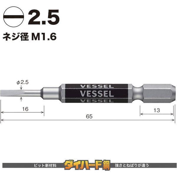 ベッセルメーカーお問い合わせ:0120-999-914【特長】●六角面すべてにカラー印刷しており、塗装品のようなにじみがなくシャープなエッジです。●10色カラーでサイズを色分けし、ビットが選びやすくなっています。●精緻な刃先加工で高い嵌合性を実現しました。●刃先部分にはメッキや塗装がつかないためネジとの食いつきが良く、様々なネジにフィットします。【用途】●建築、電気、機械組立・整備、精密組立、DIYに。【仕様】●色:黒●刃先:[[-]]2.5●全長(mm):65●セット内容:2本●セット内容(本):2●シャンク径(mm):6.35【仕様2】●マグネット入り●差込軸:6.35mm●軸色:水●片頭●18Vインパクト対応【材質/仕上】●ビット材【注意】●作業時は、保護メガネを着用してください。●必要以上に無理な力で使用しないでください。●工具は、本来の使用目的以外で使用しないでください。●電流が流れているものには使用しないでください。●正しい用途・サイズ・使い方を確かめてご使用ください。【原産国】日本