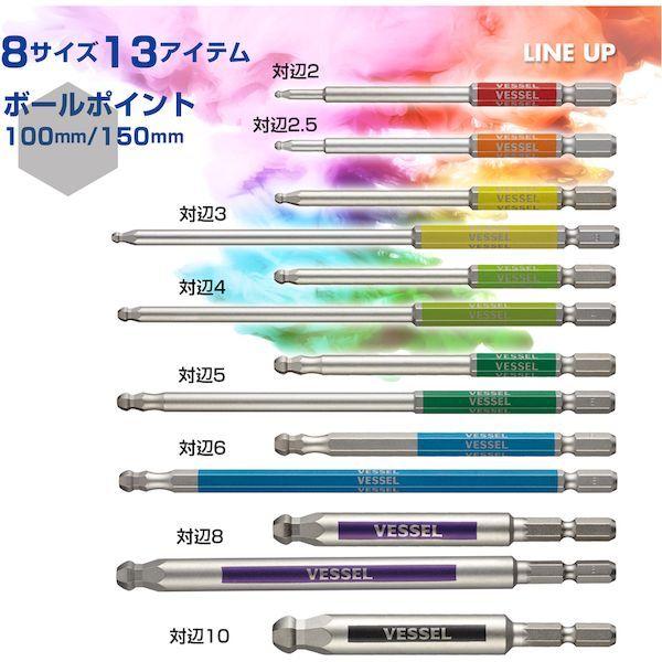 ベッセルメーカーお問い合わせ:0120-999-914【特長】●ボールポイントビットは、駆動部が六角穴の入り口付近に接触する当社独自の「レインボール形状」をもとに設計しています。●平均傾き角度は26°(設計値)、しかもボール首部の断面積が大きいので耐久性は抜群です。●六角面にカラー印刷しており、塗装品のようなにじみがなくシャープなエッジです。●精緻な刃先加工で高い嵌合性を実現しました。●10色カラーでサイズを色分けし、ビットが選びやすくなっています。●ビット材はダイハード鋼(最高硬度HRC62)を使用しています。(対辺8、10を除く)●強くてしなやかなで耐久性は抜群です。●刃先部分にはメッキや塗装がつかないためネジとの食いつきが良く、様々なネジにフィットします。【用途】●建築、電気、機械組立・整備、精密組立、DIYに。【仕様】●対辺(mm):3●全長(mm):100●色:黄●セット内容(本):1●刃先(mm):対辺3【仕様2】●先端:マグネット入り●18Vインパクト対応【材質/仕上】●ダイハード鋼(最高硬度HRC62)【注意】●作業時は、保護メガネを着用してください。●必要以上に無理な力で使用しないでください。●工具は、本来の使用目的以外で使用しないでください。●電流が流れているものには使用しないでください。●正しい用途・サイズ・使い方を確かめてご使用ください。【原産国】日本