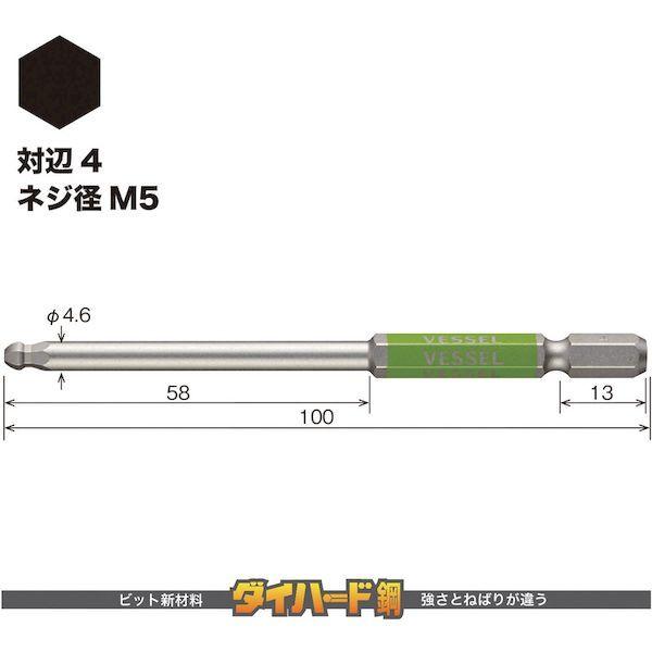 ベッセルメーカーお問い合わせ:0120-999-914【特長】●ボールポイントビットは、駆動部が六角穴の入り口付近に接触する当社独自の「レインボール形状」をもとに設計しています。●平均傾き角度は26°(設計値)、しかもボール首部の断面積が大きいので耐久性は抜群です。●六角面にカラー印刷しており、塗装品のようなにじみがなくシャープなエッジです。●精緻な刃先加工で高い嵌合性を実現しました。●10色カラーでサイズを色分けし、ビットが選びやすくなっています。●ビット材はダイハード鋼(最高硬度HRC62)を使用しています。(対辺8、10を除く)●強くてしなやかなで耐久性は抜群です。●刃先部分にはメッキや塗装がつかないためネジとの食いつきが良く、様々なネジにフィットします。【用途】●建築、電気、機械組立・整備、精密組立、DIYに。【仕様】●対辺(mm):4●全長(mm):100●色:黄緑●セット内容(本):1●刃先(mm):対辺4【仕様2】●先端:マグネット入り●18Vインパクト対応【材質/仕上】●ダイハード鋼(最高硬度HRC62)【注意】●作業時は、保護メガネを着用してください。●必要以上に無理な力で使用しないでください。●工具は、本来の使用目的以外で使用しないでください。●電流が流れているものには使用しないでください。●正しい用途・サイズ・使い方を確かめてご使用ください。【原産国】日本