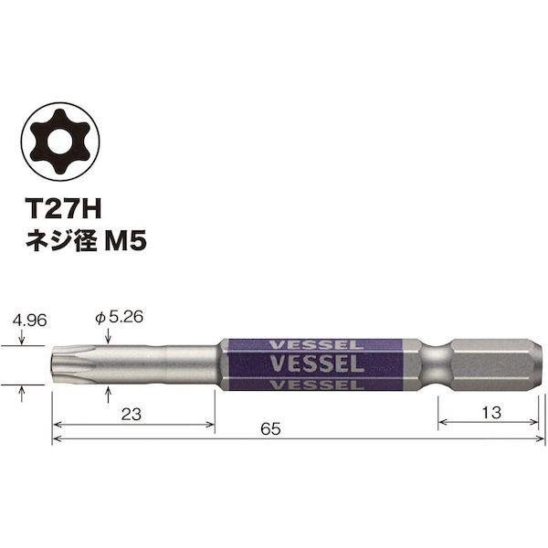 ベッセルメーカーお問い合わせ:0120-999-914【特長】●トルクス[[R下]]独特なネジ穴形状にフィットする世界標準の寸法で加工しています。●正式ライセンスをもとに製造するトルクス[[R下]]ビットです。●六角面すべてにカラー印刷しており、塗装品のようなにじみがなくシャープなエッジです。●精緻な刃先加工で高い嵌合性を実現しました。●刃先部分にはメッキや塗装がつかないためネジとの食いつきが良く、様々なネジにフィットします。●10色カラーでサイズを色分けし、ビットが選びやすくなっています。【用途】●建築、電気、機械組立・整備、精密組立、DIYに。【仕様】●刃先:T27H●全長(mm):65●色:紫●セット内容(本):1【仕様2】●先端:マグネット入り●18Vインパクト対応●シャンク径:6.35mm●トルクス(いじり止め付き)●片頭【材質/仕上】●ビット材【注意】●作業時は、保護メガネを着用してください。●必要以上に無理な力で使用しないでください。●工具は、本来の使用目的以外で使用しないでください。●電流が流れているものには使用しないでください。●正しい用途・サイズ・使い方を確かめてご使用ください。【原産国】日本