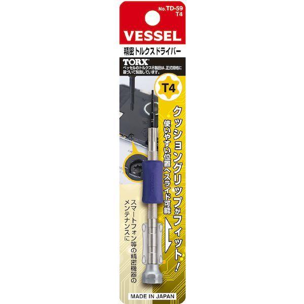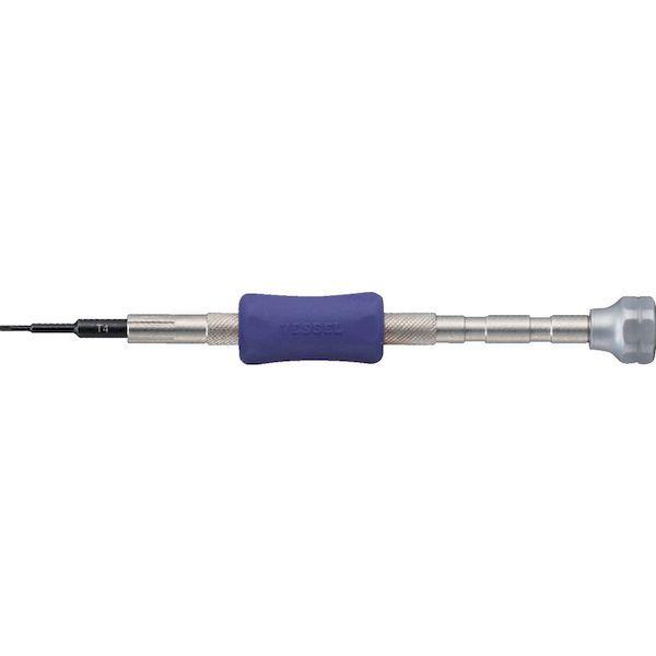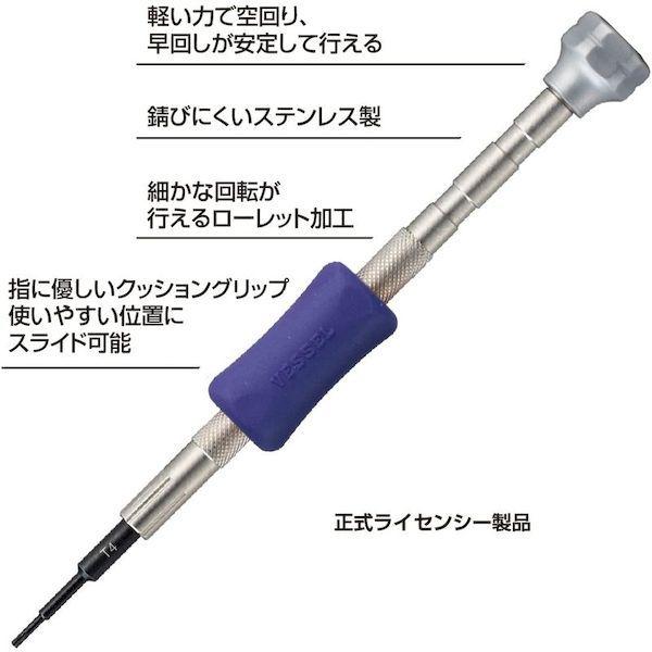 ベッセルメーカーお問い合わせ:0120-999-914【特長】●携帯端末などに使われる精密ねじ(トルクス)用の精密ドライバーです。●ベッセルは、TORX規格の正式ライセンシーです。●手に優しく、調整作業で使いやすいクッショングリップで、樹脂のグリップを使いやすい位置にスライドできます。●早回しに便利な回転キャップ&ローレット加工です。【用途】●パソコン等の精密機器のメンテナンスに。【仕様】●刃先:T4●全長(mm):100●軸長(mm):20●対辺(mm):1.29●色:紫【仕様2】●軸:黒染め仕上げ●全身焼入●クッショングリップ:緑【材質/仕上】●本体:ステンレス鋼、ポリプロピレン●軸:特殊合金鋼●グリップ:エラストマー樹脂●軸:特殊合金鋼●グリップ:エラストマー樹脂【注意】●作業時は、保護メガネを着用してください。●正しい用途・サイズ・使い方を確かめてご使用ください。●電気作業ではショート事故・感電にご注意ください。●過負荷はネジの破損やけがの原因となります。●家庭ではお子様に注意して保管してください。【原産国】日本