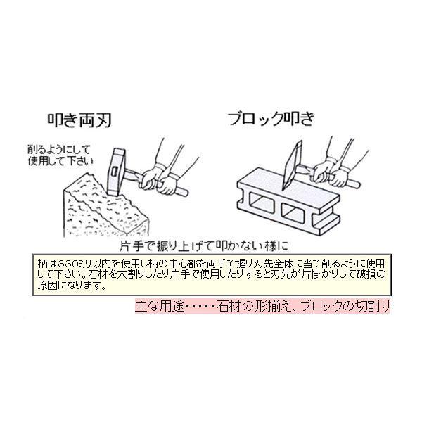 ●主な用途は石材の角付けになります。刃先全体を平均に当て、前方に削るように使用して下さい。●叩き両刃は石材専用です、石材の面荒し、角揃え、面取り用の工具ですので大割り切断等には使用しないで下さい。※使用上に注意超硬合金付叩き両刃は耐摩耗性に優れ永くお使いいただけます。刃先は必ず研いでご使用下さい。砥石はGCを使用し水につけずに自然冷却して下さい。石材以外には使用しないで下さい。超硬合金付叩き両刃は耐摩耗性には優れておりますが、衝撃には非常にもろい性質の商品です。※間違った使い方により超硬合金を破損する場合が多いので注意してご使用ください。C-51 叩き両刃 寸法:30mm 頭の全長:160mm 頭の重量:530g チップ寸法:3x12x30 柄付き