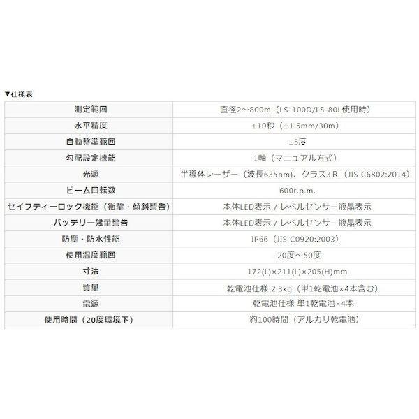 トプコンメーカーお問い合わせ:0120-933297【商品説明】●人間工学からデザインし握りやすい大きなハンドル、機能が分かり易い表示ボタンです。●IP66に加え、振動、落下、温度、湿度試験をクリアの堅牢設計です。●1軸の勾配設定も可能です。●デジタル表示レベルセンサーで差分をデジタルでも表示する高性能レベルセンサーを付属します。●保護等級:IP66●電源:単1アルカリ乾電池×4本(付属)●測定範囲:直径約2~800m(受光器LS-100D、LS-80L使用時)●JSIMA(日本測量機器工業会)検査書発行可(有料)●ビーム回転数:600rpm●電池寿命:約100時間(アルカリ乾電池)動作温度範囲:-20~+50℃●波長:635nm●縦(mm):205●横(mm):211●精度:±10●自動補正範囲:±5°●精度水平:±10°(±1.5mm/30m)●レーザー色:赤●ねじ径(インチ):5/8セット内容●レーザーレベル:RL-H5A●受光器:LS-100D●バッテリーホルダ●単1乾電池4本●レベルセンサーホルダ●単3電池2本●格納ケース●取扱説明書●安全上のご注意●標準構成品一覧●保証書