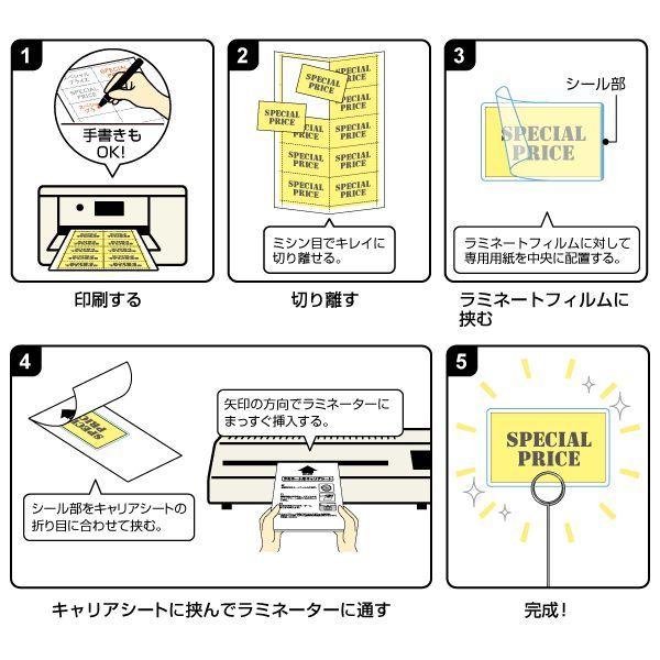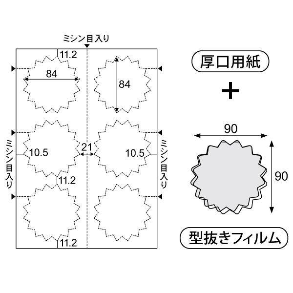 【商品説明】●ハサミ、カッターは不要!オリジナルのラミネートPOPがカンタン・キレイに作成できます。専用用紙と型抜きラミネートフィルムがセットになったPOP作成キットです。●セット内容:厚紙用紙(A4)3シート、型抜きラミネートフィルム18枚、キャリアシート1枚●入数:18●用紙サイズ(ギザギザ型):84×84mm●フィルムサイズ(ギザギザ型):90×90mm●用紙厚さ:0.18mm●フィルム厚さ:100μm