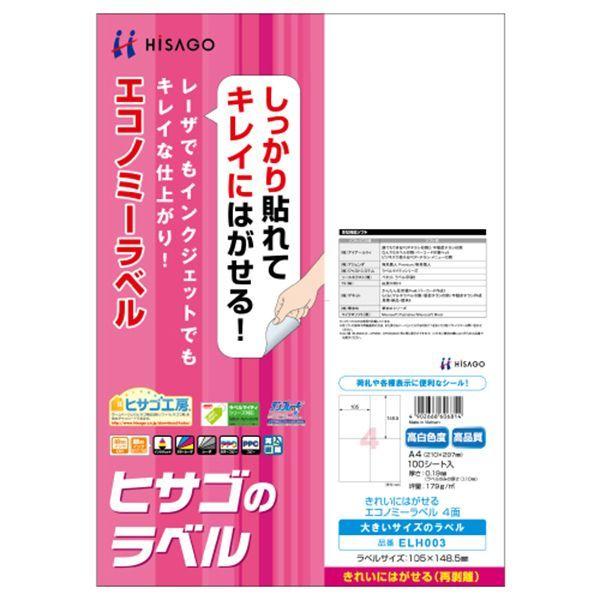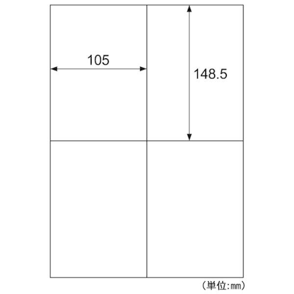【商品説明】●いろいろなプリンタで使用できるラベルです。しっかり貼れてキレイにはがせる再剥離タイプです。●レーザ・インクジェット・コピー対応●入数:100●用紙サイズ:A4(210×297mm)●ラベルサイズ:105×148.5mm●面付:4 面●厚さ:0.19mm●ラベルのみの厚さ:0.10mm●坪量:179 g/m2●素材:上質紙 ※剥離紙はリサイクル可能です。